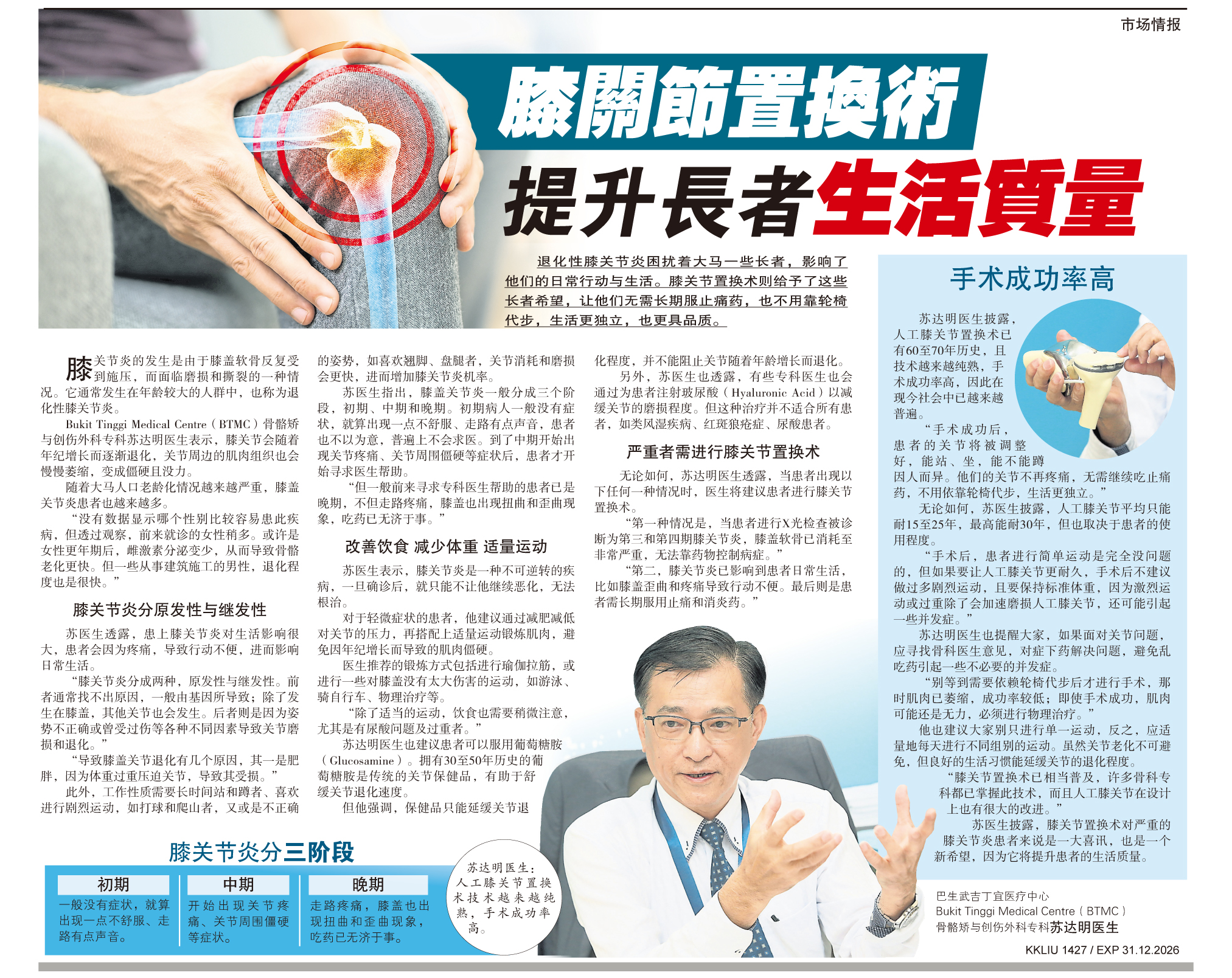 Bukit Tinggi Medical Centre(BTMC)骨骼矫与创伤外科专科苏达明医生表示,膝关节会随着年纪增长而逐渐退化,关节周边的肌肉组织也会慢慢萎缩,变成僵硬且没力。