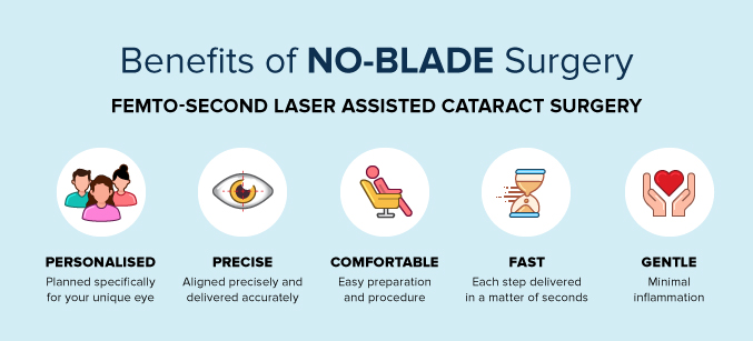 No-blade cataract surgery, also known as femtosecond laser-assisted cataract surgery (FLACS) uses a femtosecond laser (a powerful light beam) to assist in removing the cataract.